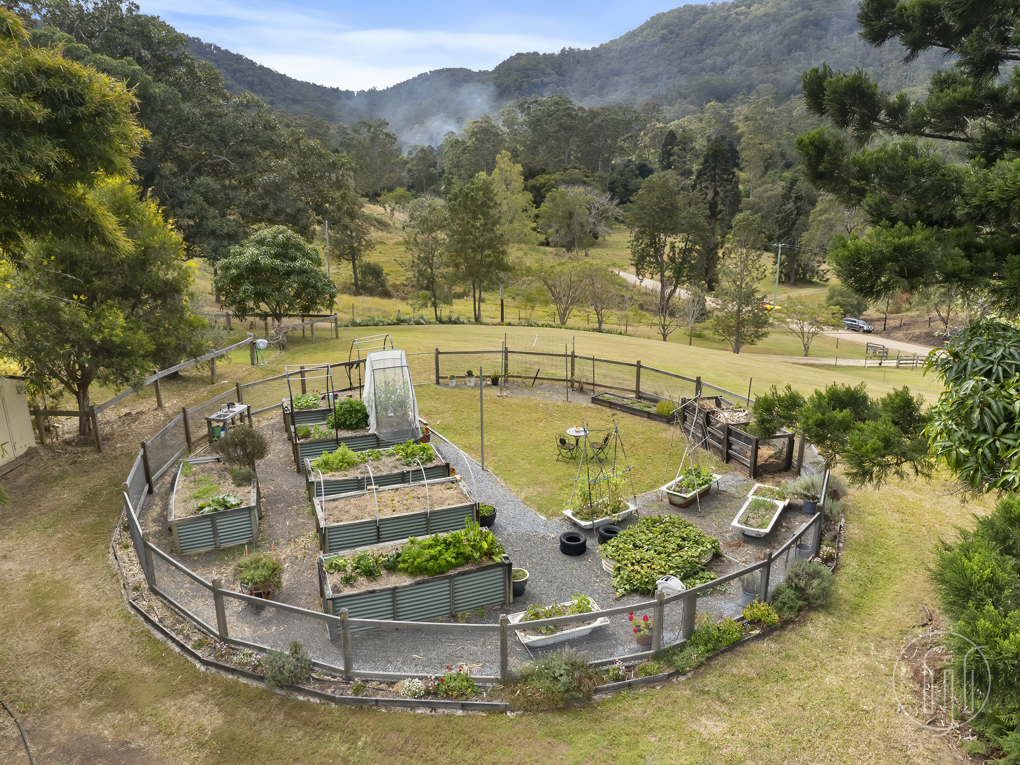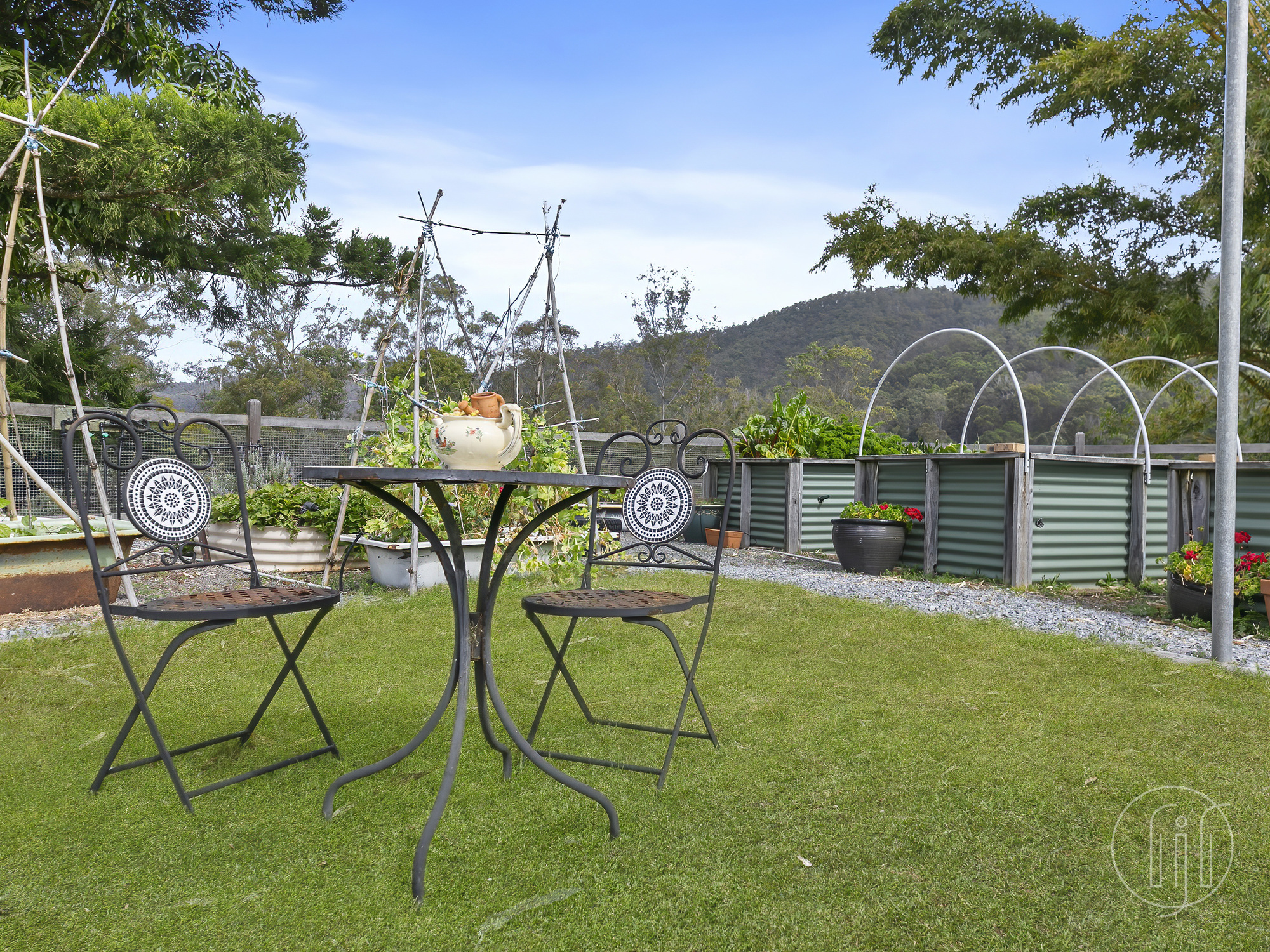 Outside and the property has been carefully planned to allow for a fenced house yard for the pets, covered barbecue area alongside the stands of bamboo, an incredible fenced veggie garden with raised beds beneath the Norfolk Pine tree, large garden shed on a concrete slab, an orchard with its own watering system and ample tank water storage.