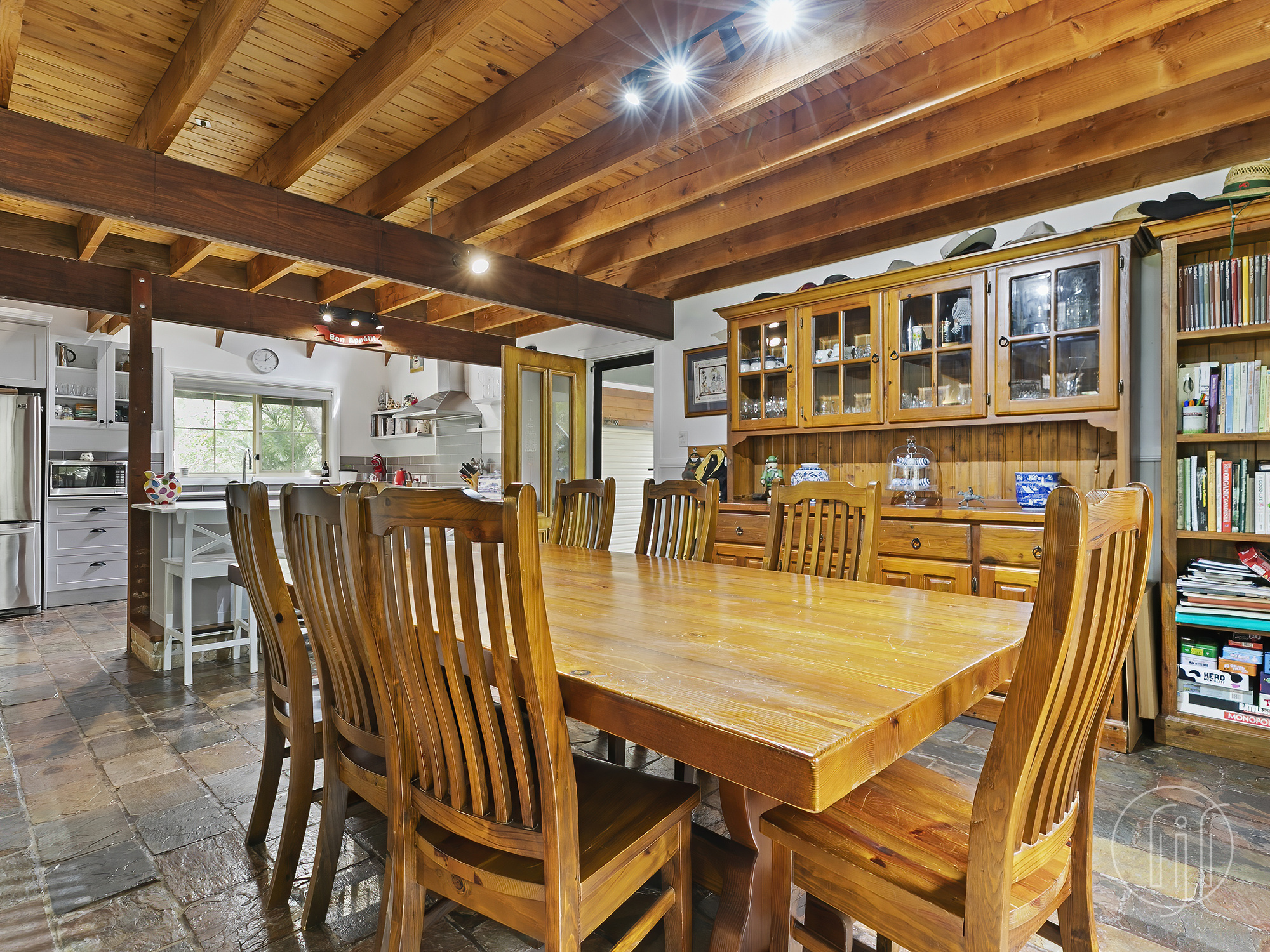 The front entrance takes you into a dual living space with slate flooring, VJ wall paneling, pine lined ceiling and exposed timber beams with the sunken lounge to the left with built in study desk, and large dining room to the right.