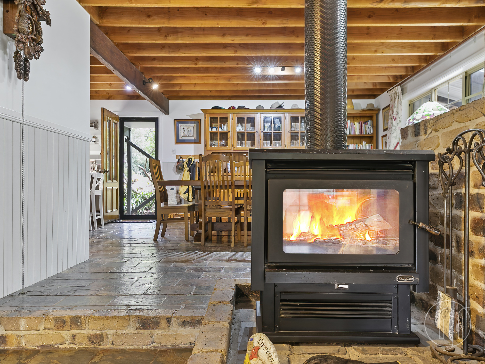 These areas are separated by a slow combustion fireplace with glass doors on either side.