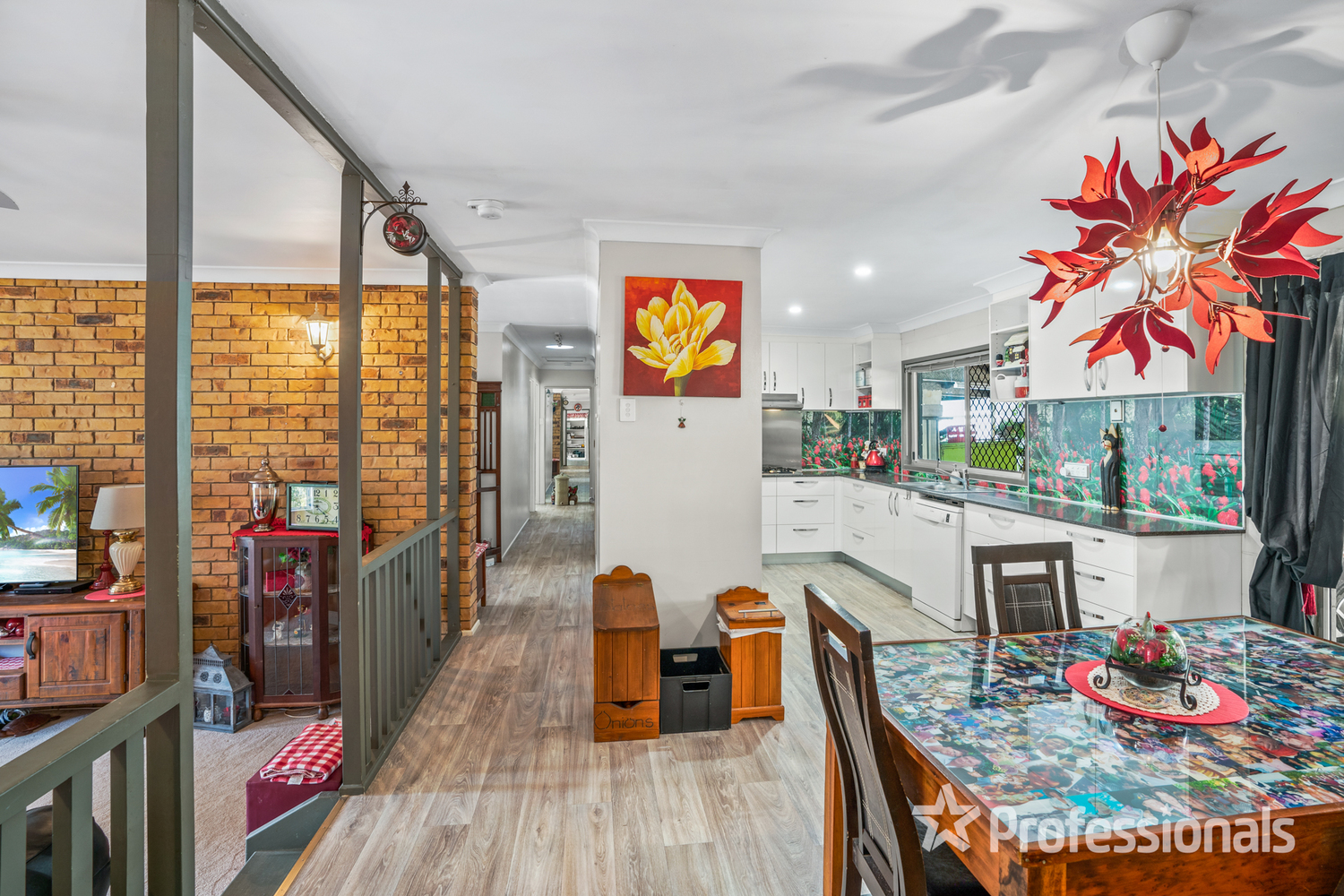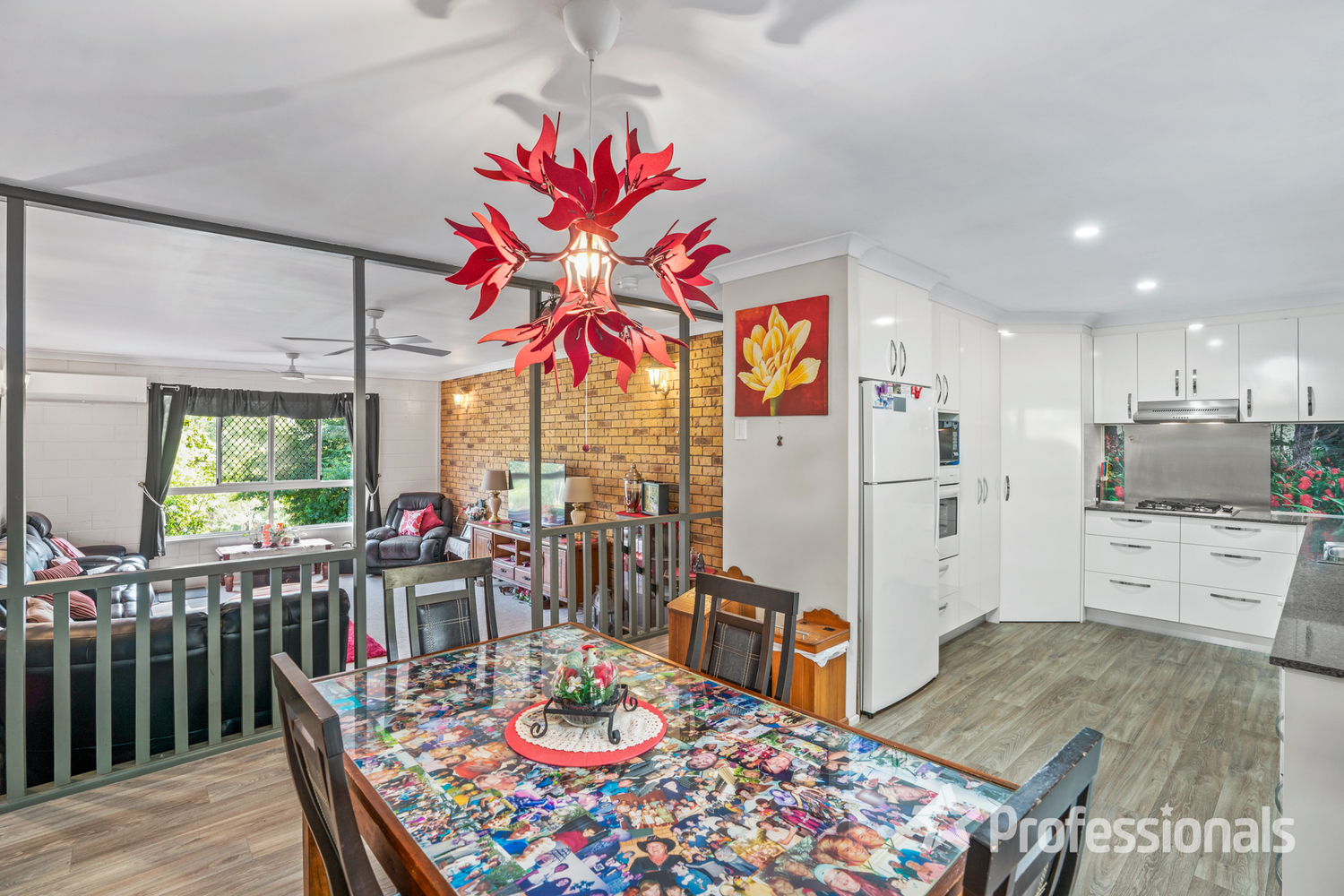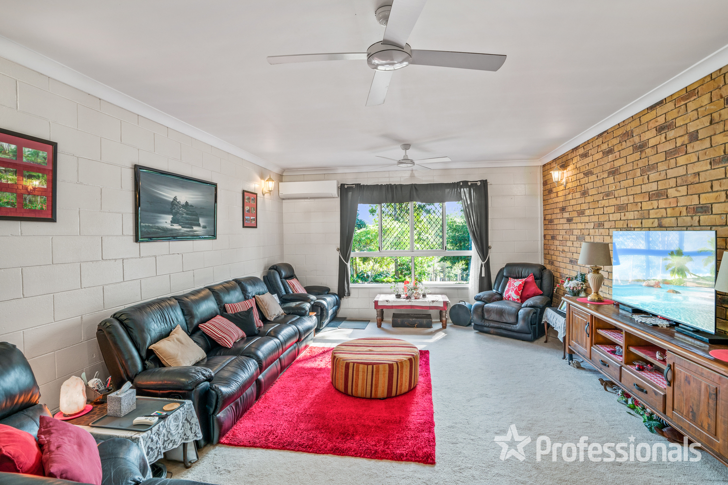 • Multiple living spaces including formal air-conditioned sunken lounge room, kitchen/dining space and optional second lounge, games or rumpus room • Main bedroom with double built-ins and ceiling fan, second bedroom with built-ins and ceiling fan, third bedroom with ceiling fan • Modern bathroom with double vanity, wheelchair friendly shower and floor to ceiling tiles