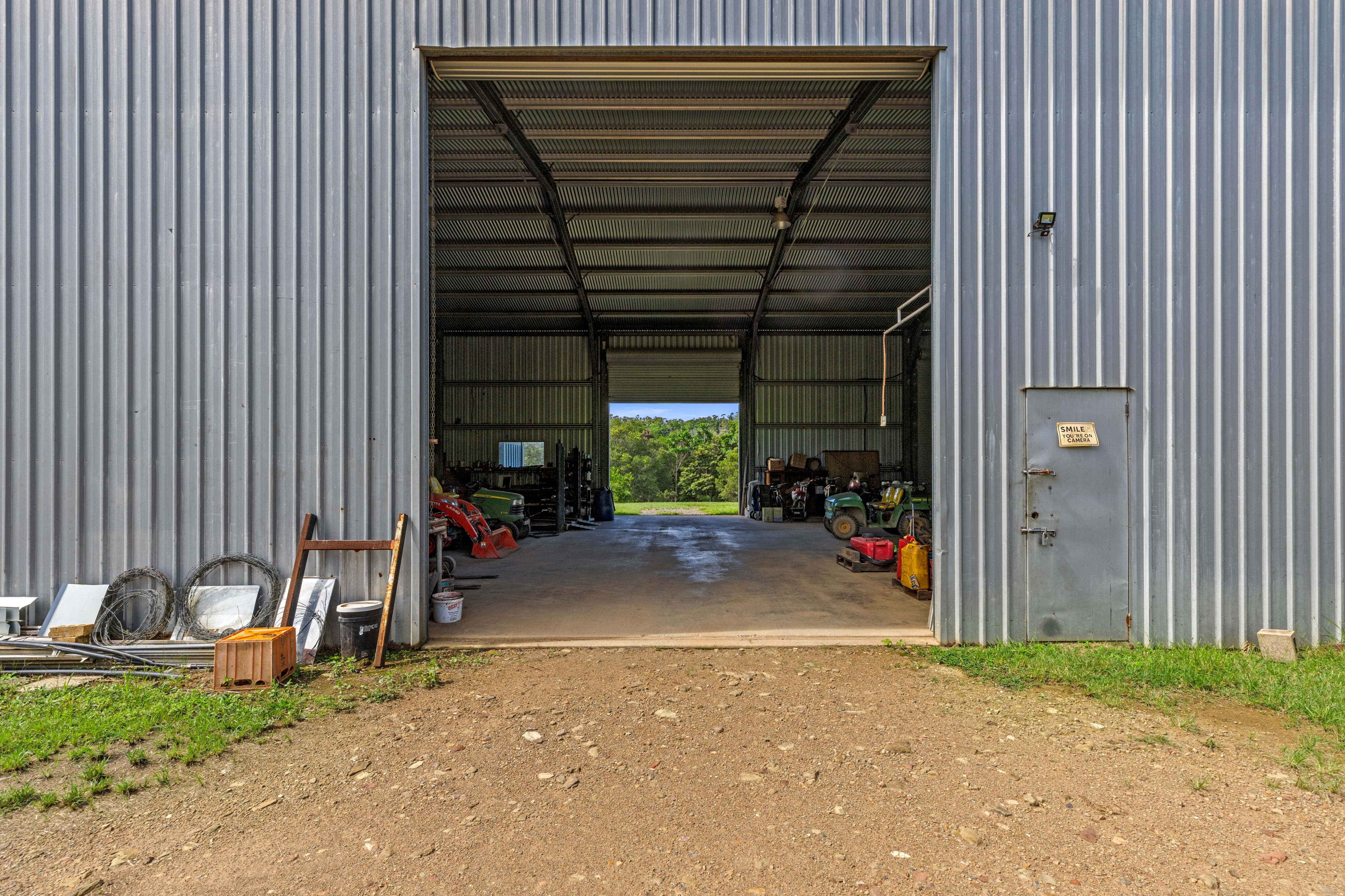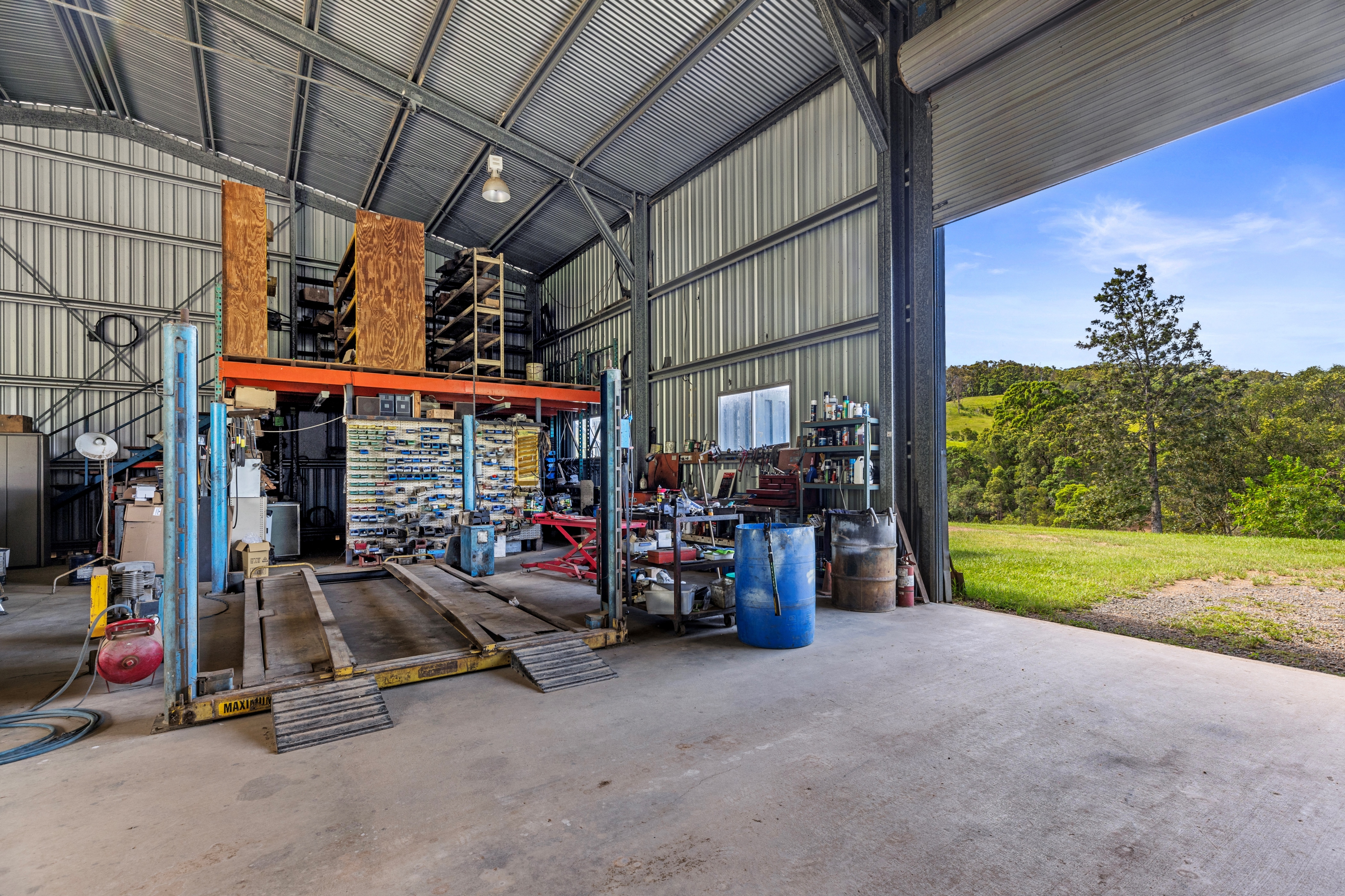 Now, about that shed-let's just say it's not your average outbuilding. This is a true tradesman's paradise: 30 meters long, 15 meters wide, and 6 meters high, with four 5-meter wide openings. Previously an engine exchange workshop, it comes complete with a four-post hoist, two mezzanine floors, floor-to-ceiling pallet racking, and a self-contained amenities area. With three-phase power and lighting that turns night into day, this shed is the ultimate workspace for any home-based business.