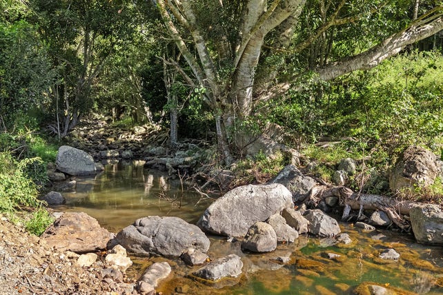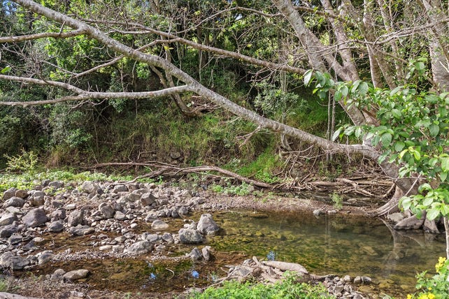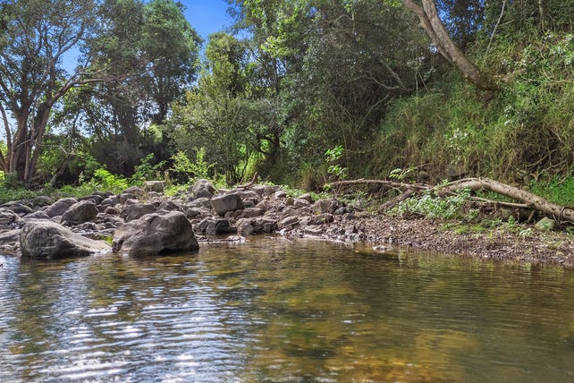 The fully fenced acreage is not only picturesque but also productive. With rich soils and established pastures including kikuyu, green panic, rhodes, and glycine, it comfortably supports 25 to 30 head of cattle. Stock water is supplied via two dams and a solar-equipped bore delivering 800 gallons per hour into two 5,000-gallon tanks. The high rainfall—around 1200mm annually—ensures lush growth and long-term sustainability.
