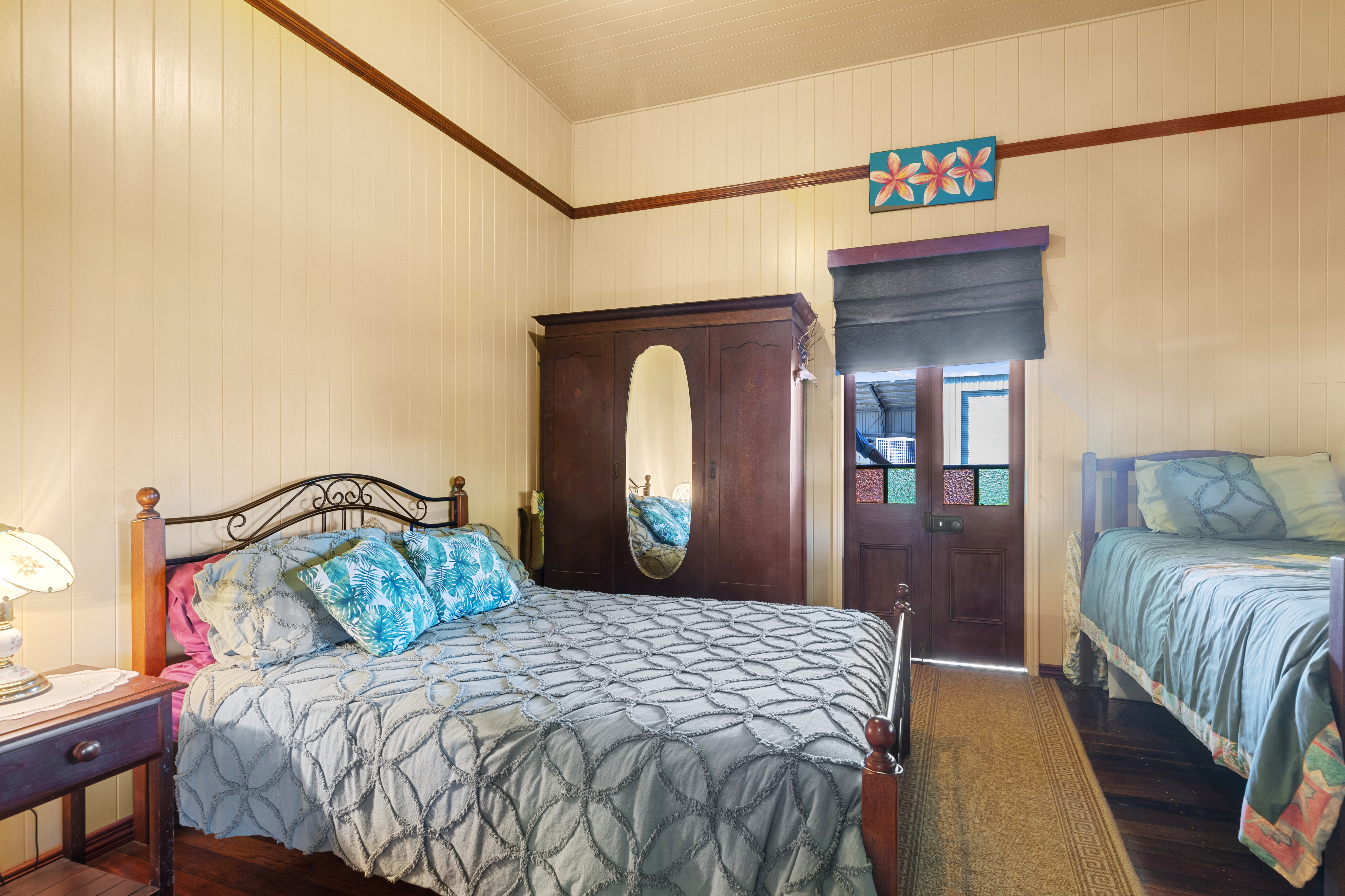 As you enter the property, a charming hoop pine-lined driveway leads you to a traditional Queenslander that exudes character and warmth. With 11-foot-high ceilings, decorative fretwork, stunning stained glass casement windows, and polished timber floorboards throughout, this home is a masterpiece of classic design.