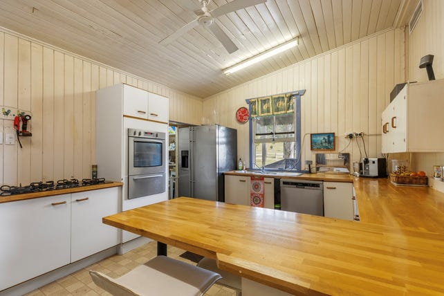 The home boasts high ceilings, VJ walls, solid timber floors, the kitchen offers a dishwasher, gas cooktop, electric wall oven, and walk-in pantry, and views from the front verandah overlooking the horse paddocks and dam. Lush lawns surround the house, complemented by veggie boxes and two chicken pens.