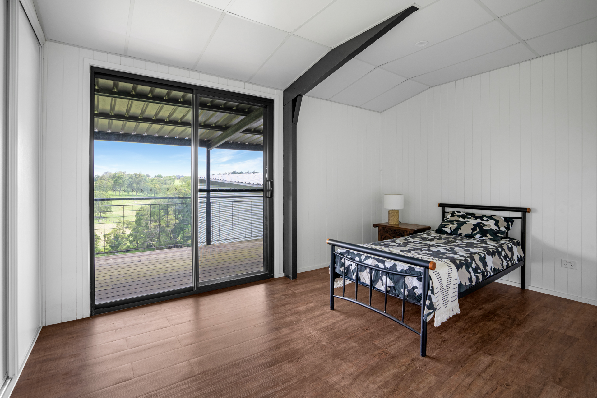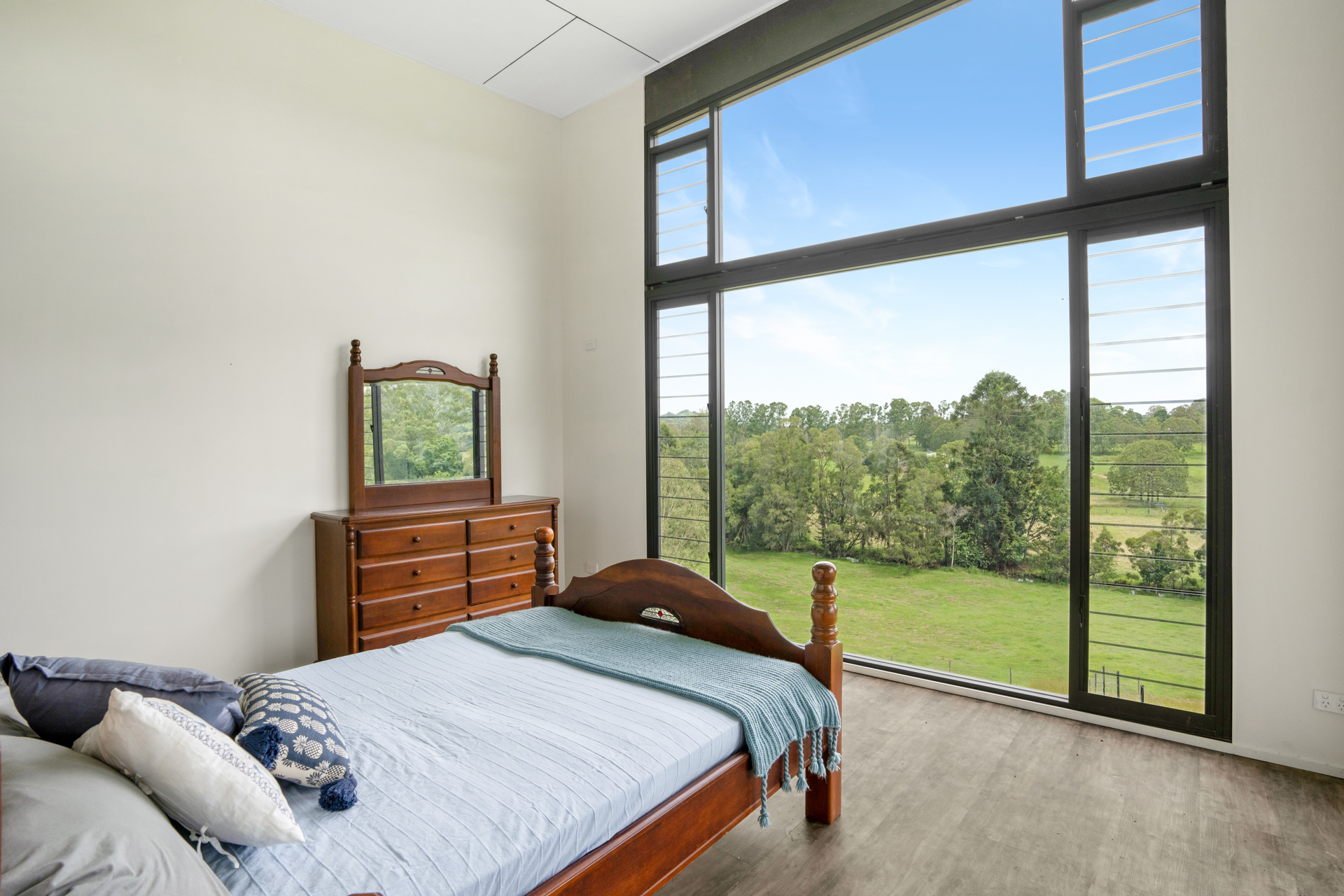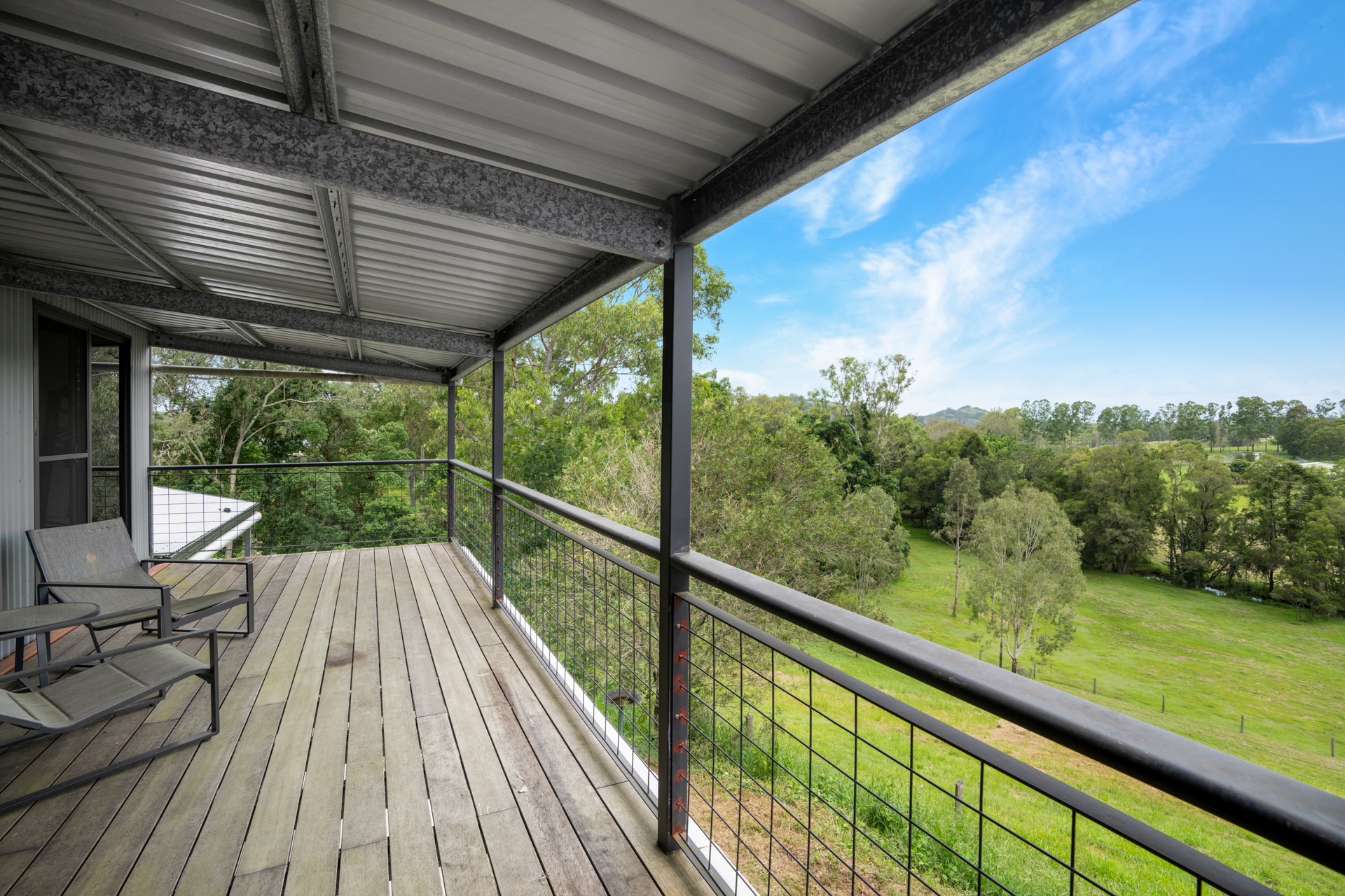 Upstairs there are 3 bedrooms which open onto a full length balcony with captivating rural views. There is also a study, bathroom and separate toilet.
