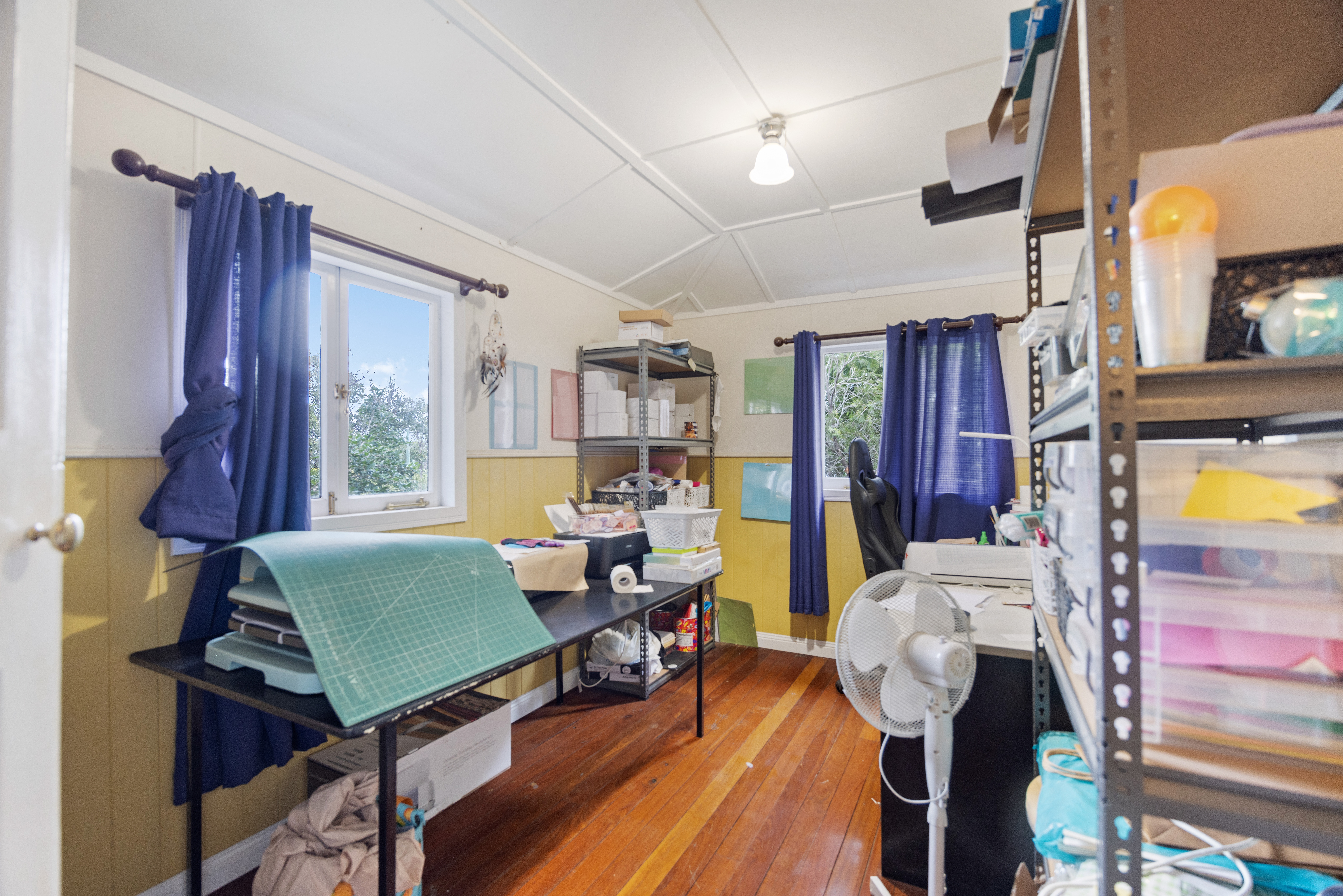 The original two-bay garage with timber floors speaks to the home's heritage, offering a space for storage.