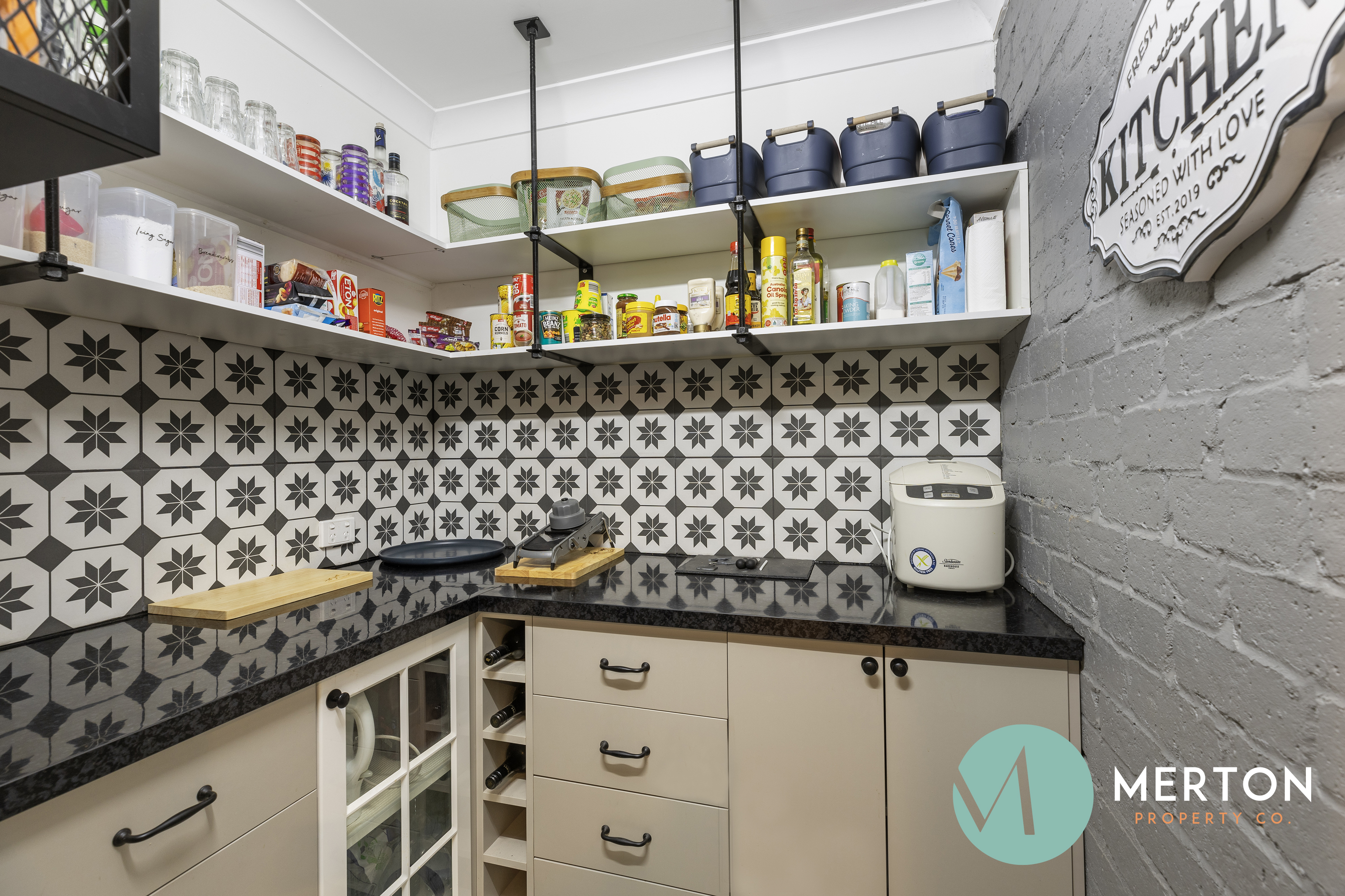 The main bathroom is cleverly divided into three separate areas: a bathtub and shower, a central vanity, and a separate toilet, making it both functional and spacious. An additional storage room with shelving at the end of the hallway ensures that everything has its place, while the enormous laundry provides ample storage and direct access to the outdoors.