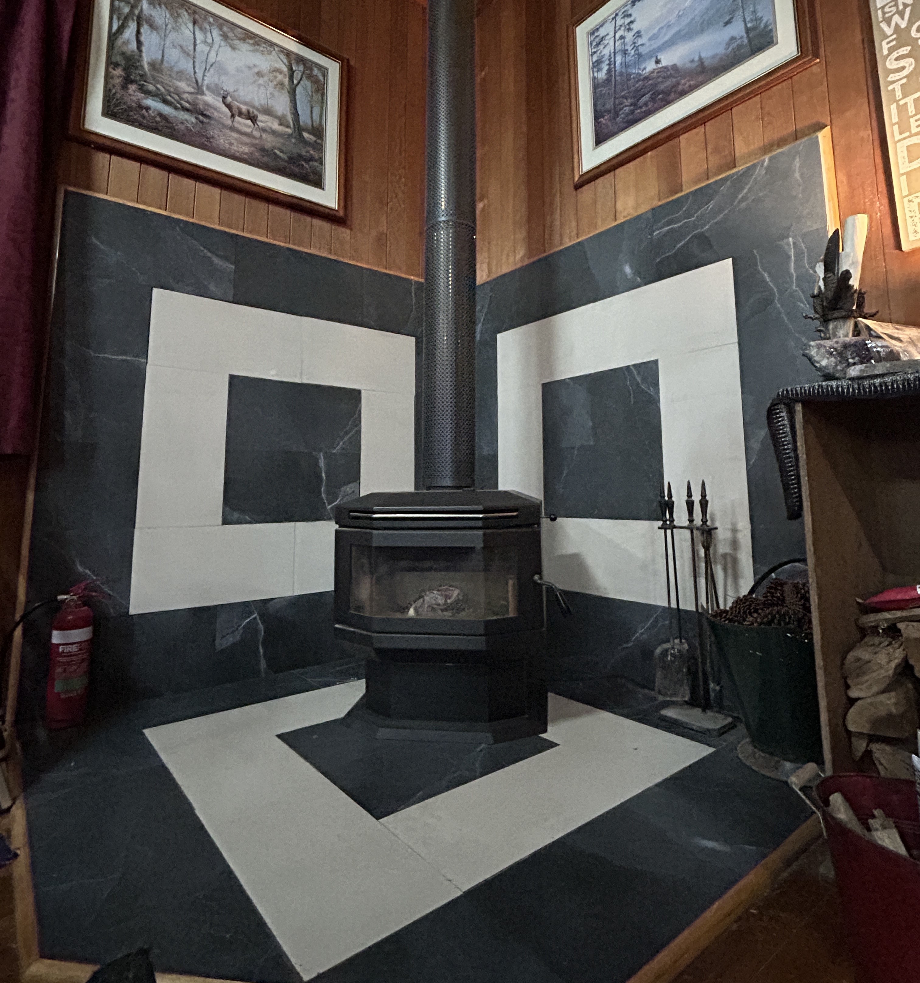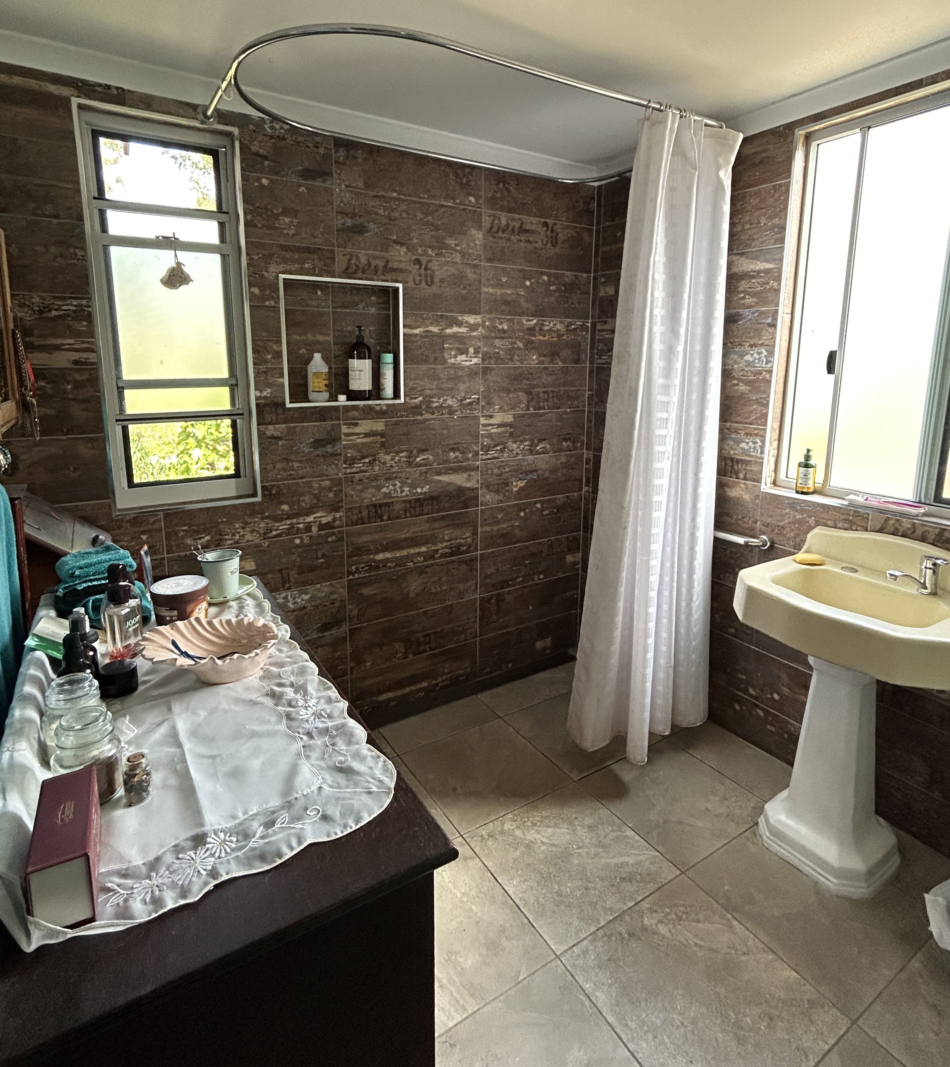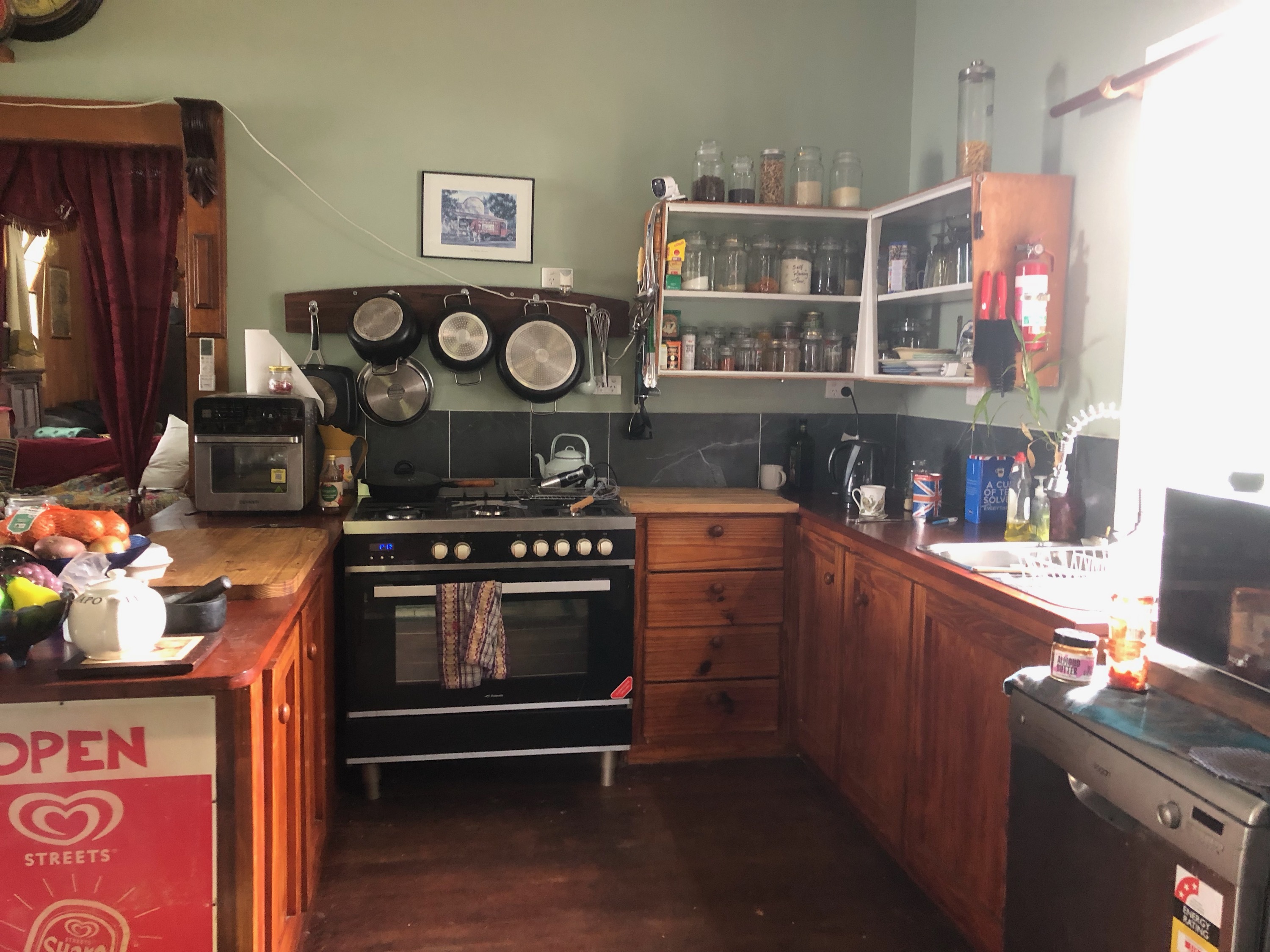 The corner piece of the main chapel room boasts a cozy wood-burning fireplace, beautifully tiled to keep you warm on cool nights. Beyond the double doors lead to a spacious airconditioned timber kitchen added in 1962, complete with ample room for the largest dining table you can imagine. The fully renovated bathroom is designed for accessibility, and an additional flushing toilet is conveniently located in the old thunderbox building just outside.