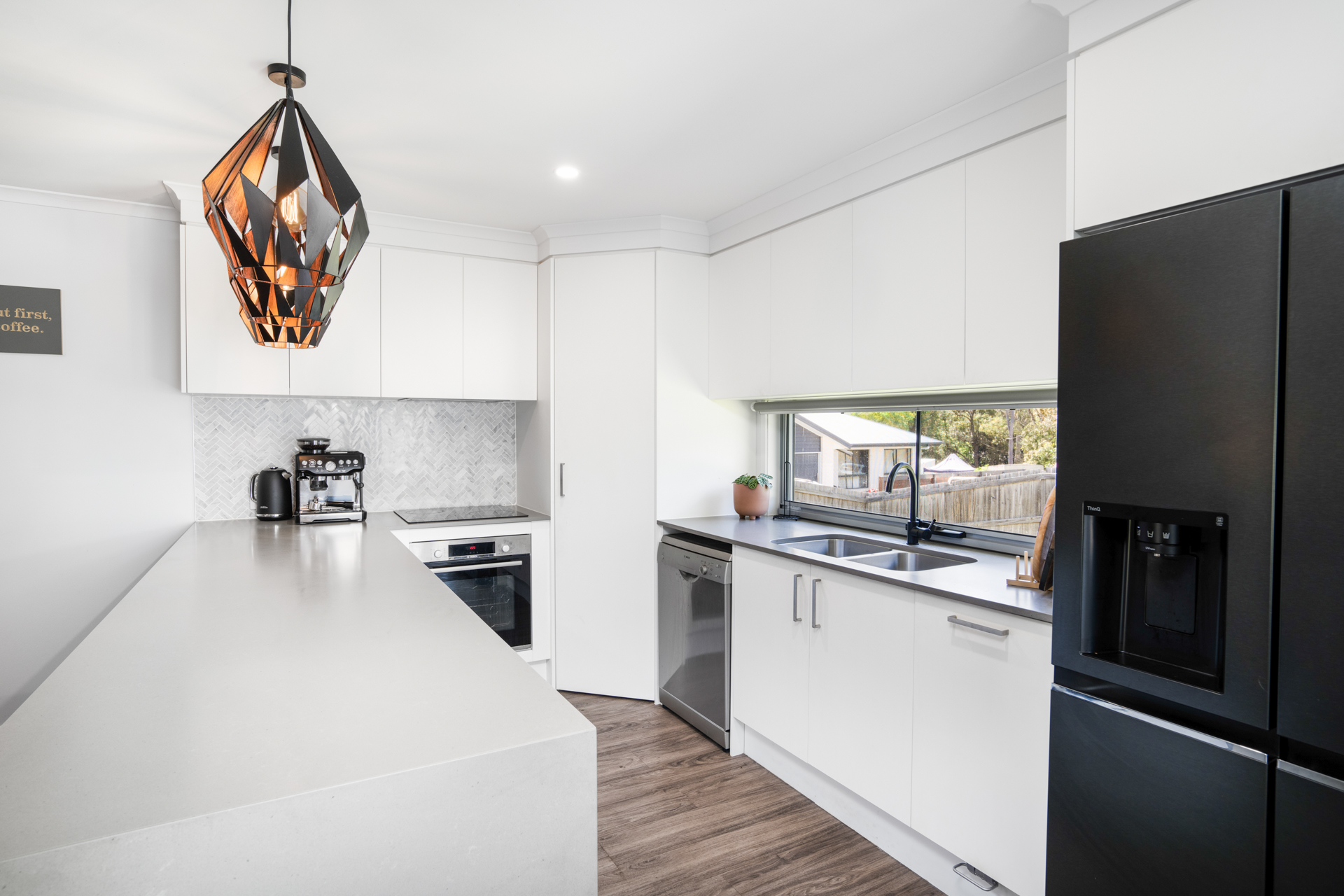 Kitchen opens onto outdoor undercover, private alfresco area - The modern kitchen comes with great bench space all in Caesar Stone and ornate pendant lighting. Double S/S sink, dishwasher, under bench oven and ceramic cooktop, pantry, microwave nook,