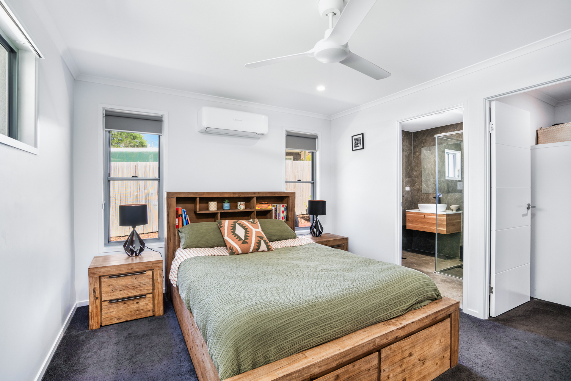 double refrigerator space and overhead cabinetry. - Master king sized bedroom with walk in robe and ensuite, A/C and ceiling fan.