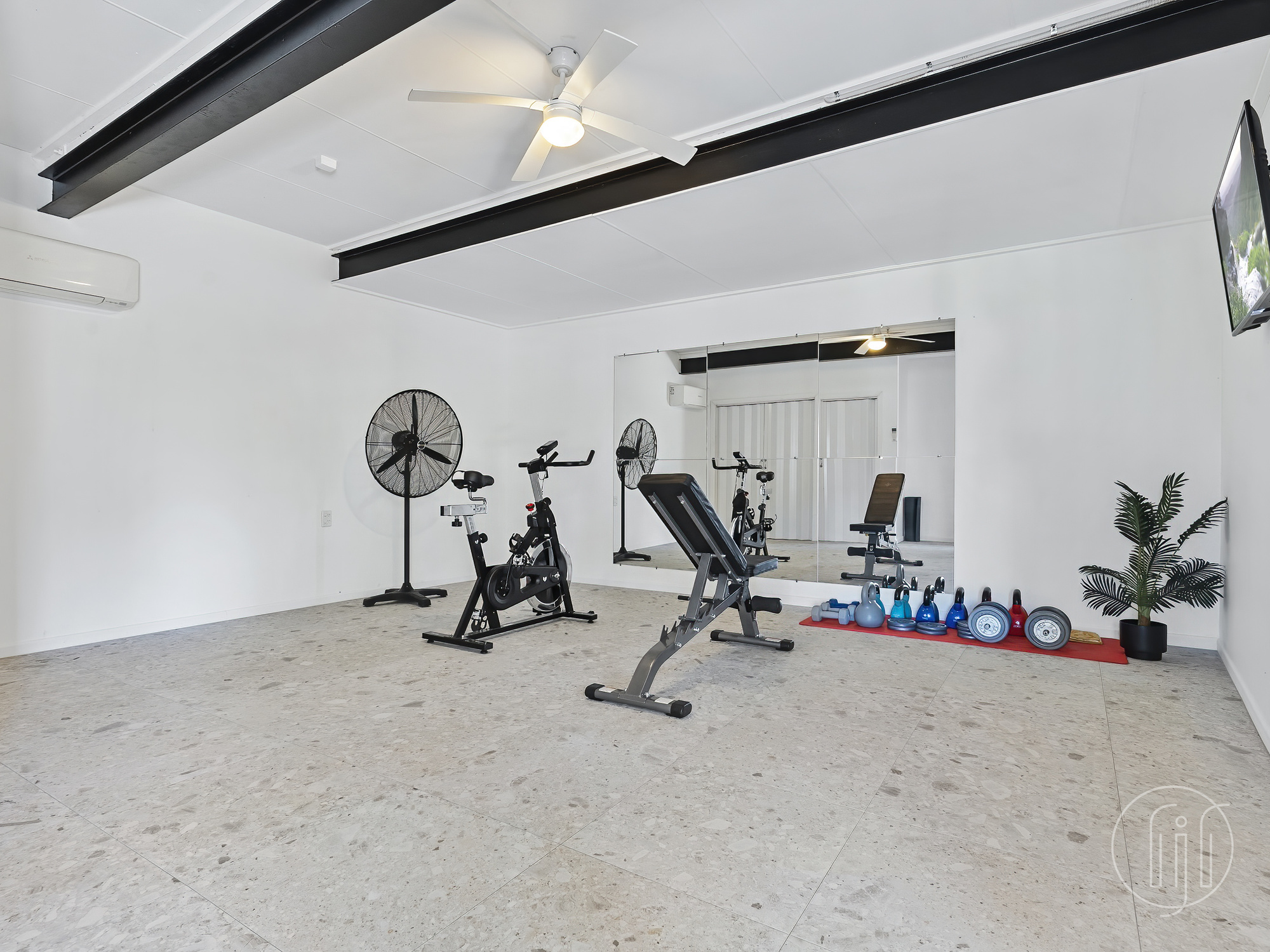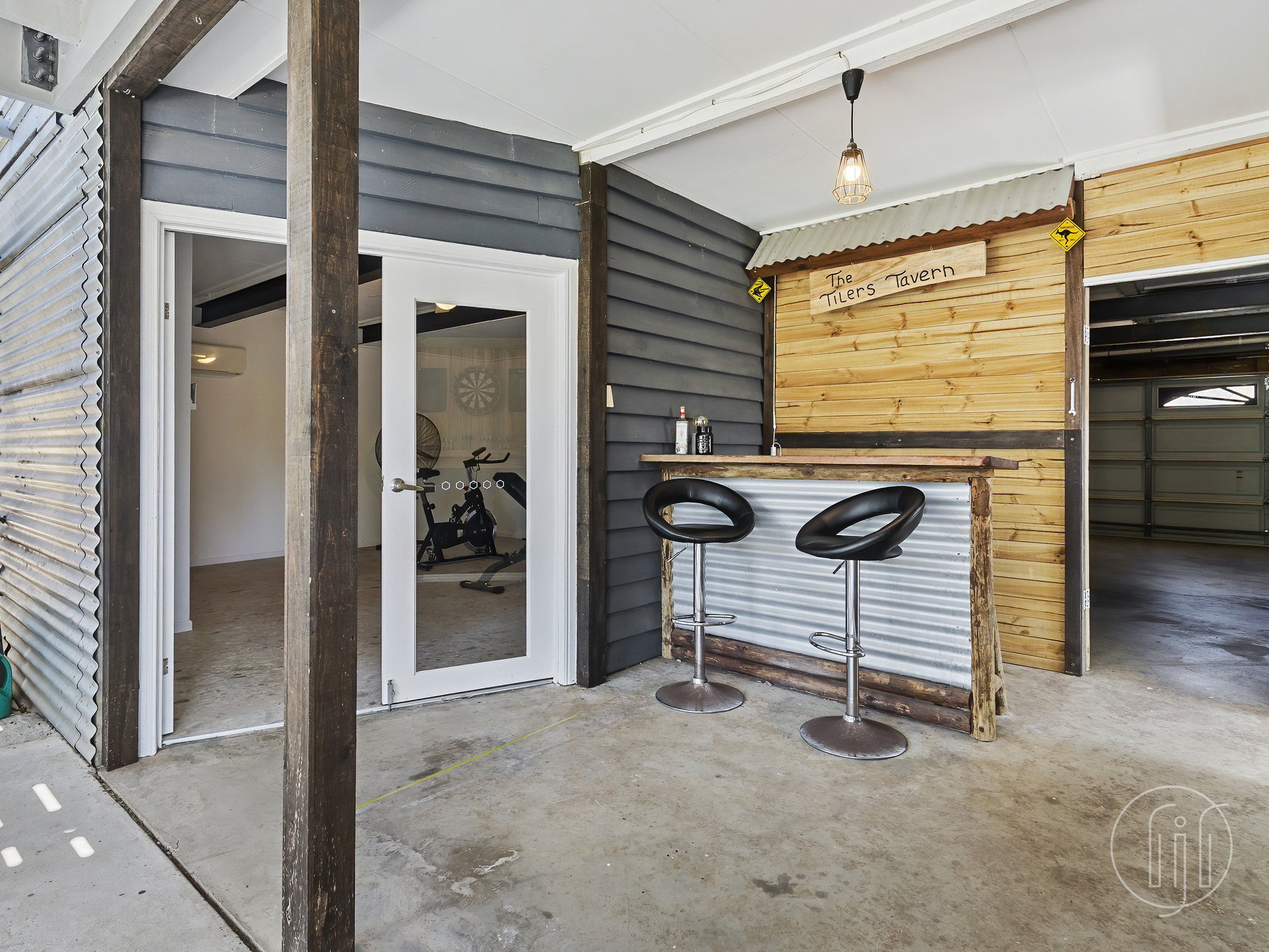 A built-in barbecue and sink, matching bar to serve the perfect drinks, and a covered sitting area utilizing the deck above. Add to this a full-sized laundry with built in storage, plus a games room or gym space with tiled floor, storage and air conditioning.