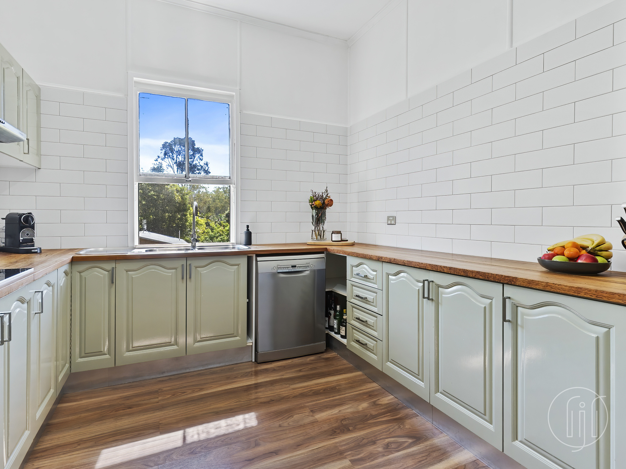 The kitchen is a cozy space with electric hotplates, wall oven and dishwasher, ample cupboards and timber benchtops.