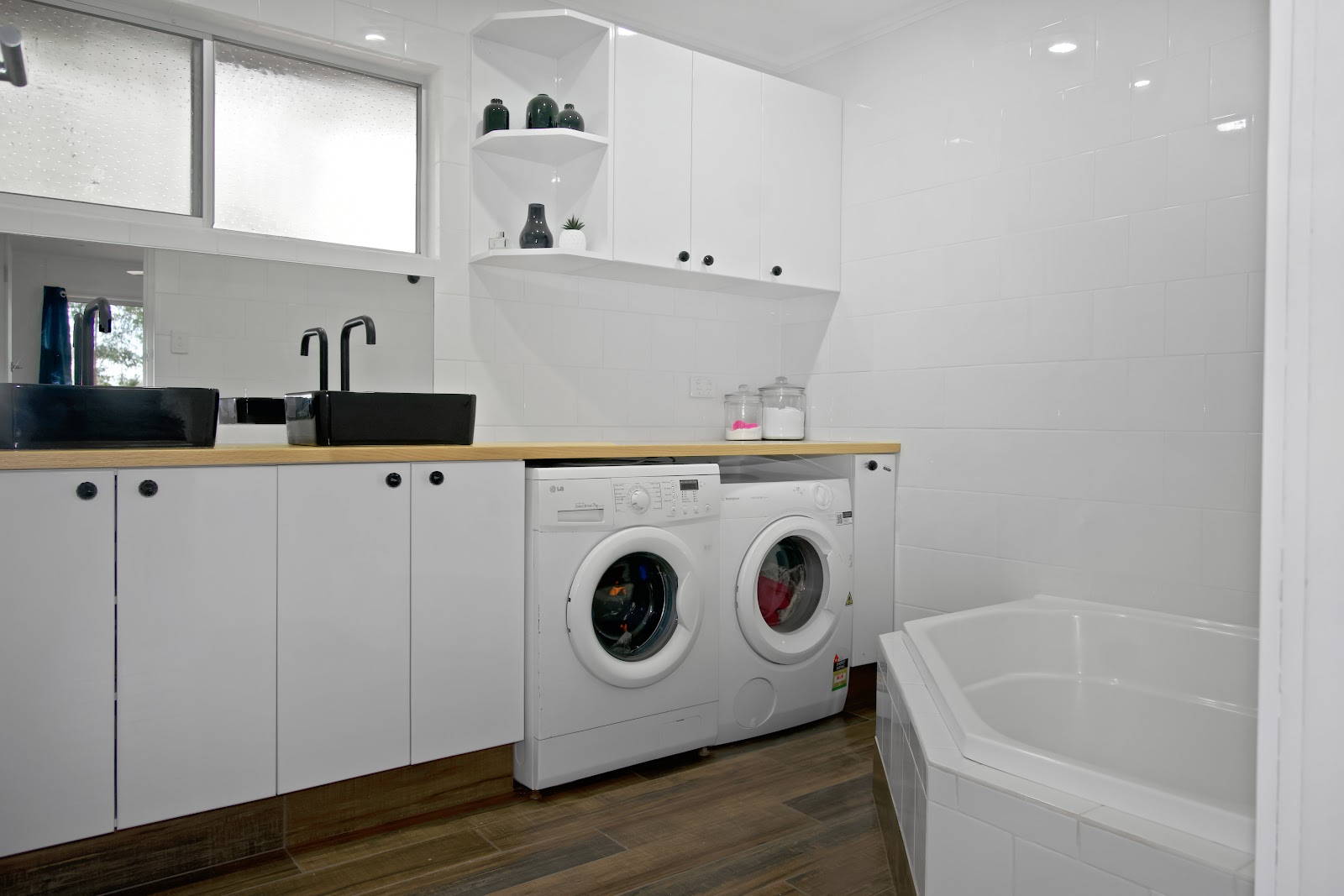 The modern, well-appointed bathroom has a touch of luxury with designer twin basins, tapware and a spa bath to indulge in and relax.